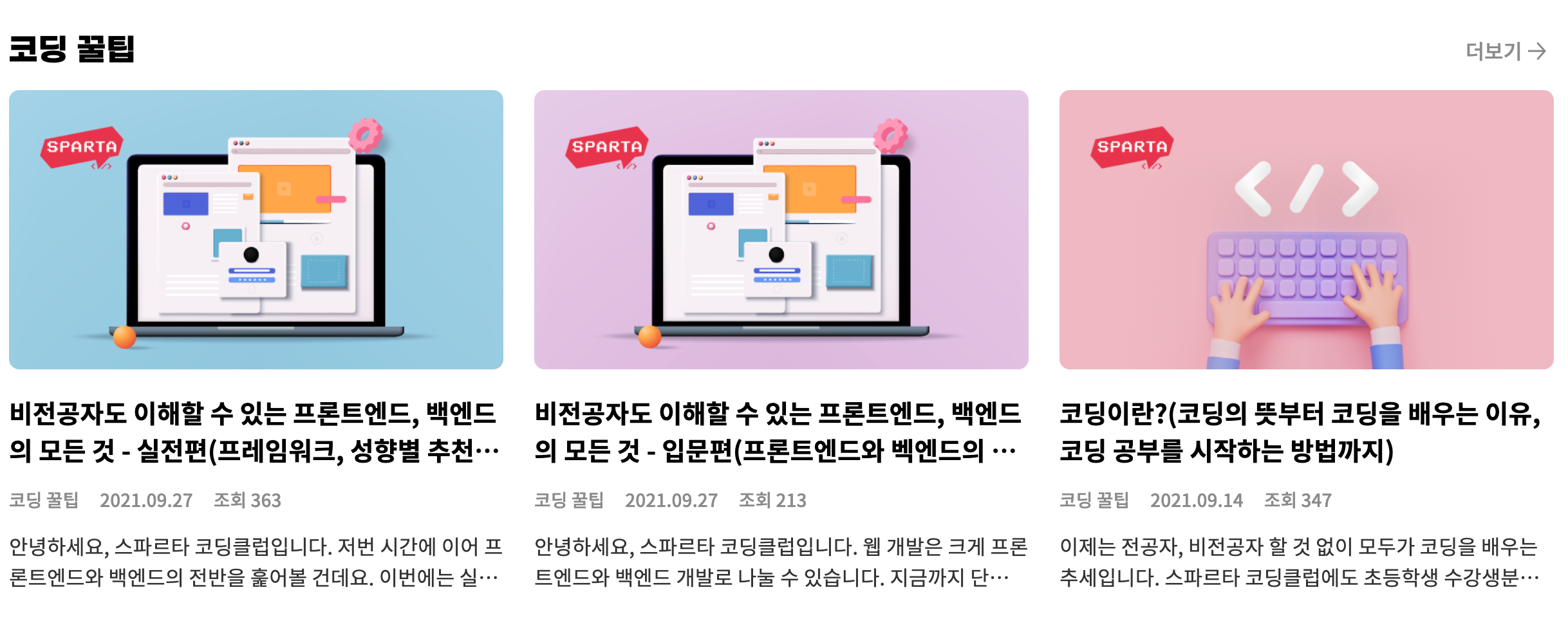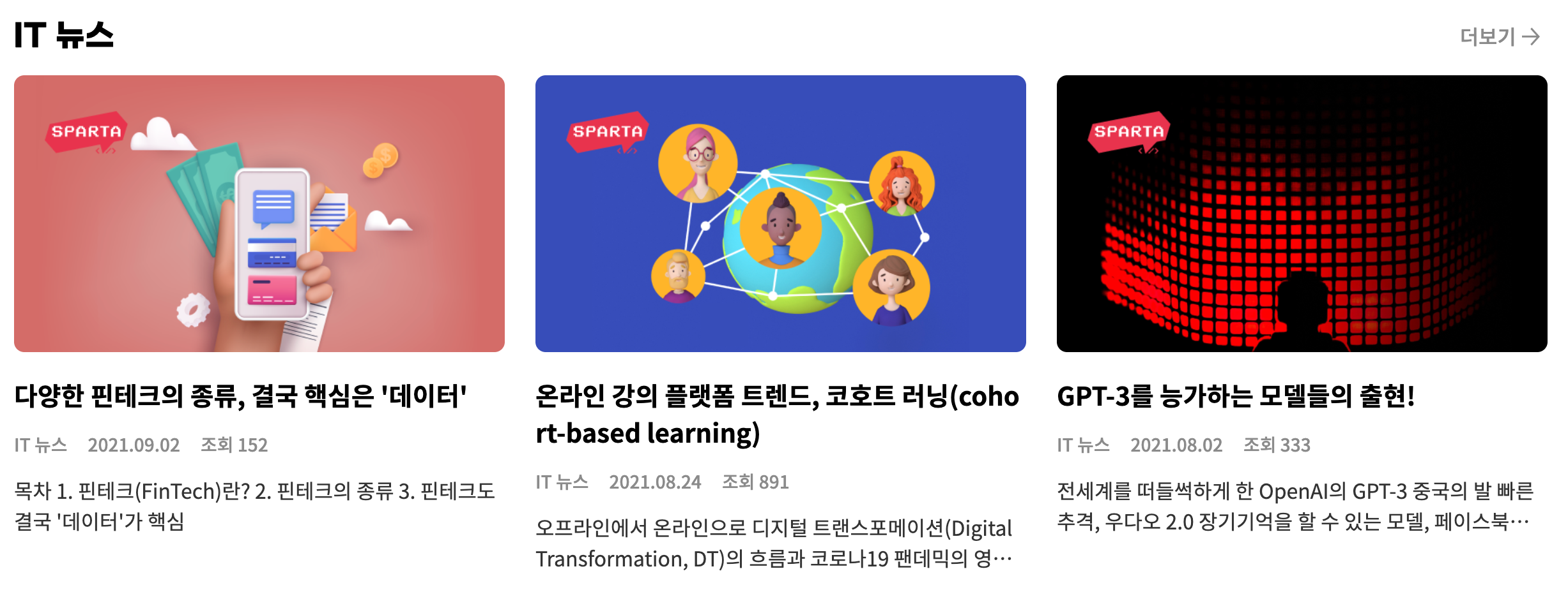 위의 학습적인 도움뿐만 아니라, 더불어 IT 뉴스와 스파르타 소식, 코딩 꿀팁까지~ 콘텐츠를 제공하고 있어요.