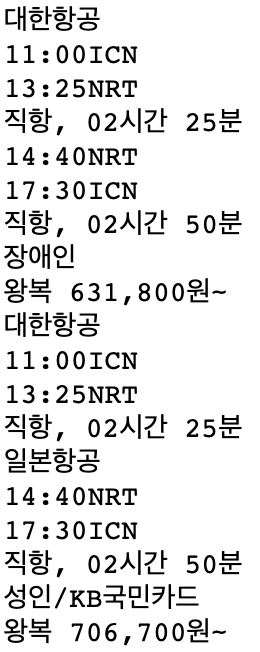 가는 날 선택 -> 이번 달 24일, 27일 선택 -> 도착지 버튼 누르기 (일본, 도쿄, 항공권 검색) -> 결과 text들 뽑아내기