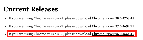 Current Releases If you are using Chrome version 98, please download ChromeDriver 98.0.4758.48 If you are using Chrome version 97, please download ChromeDriver 97.0.4692.71 If you are using Chrome version 96, please download ChromeDriver 96.0.4664.45 For o