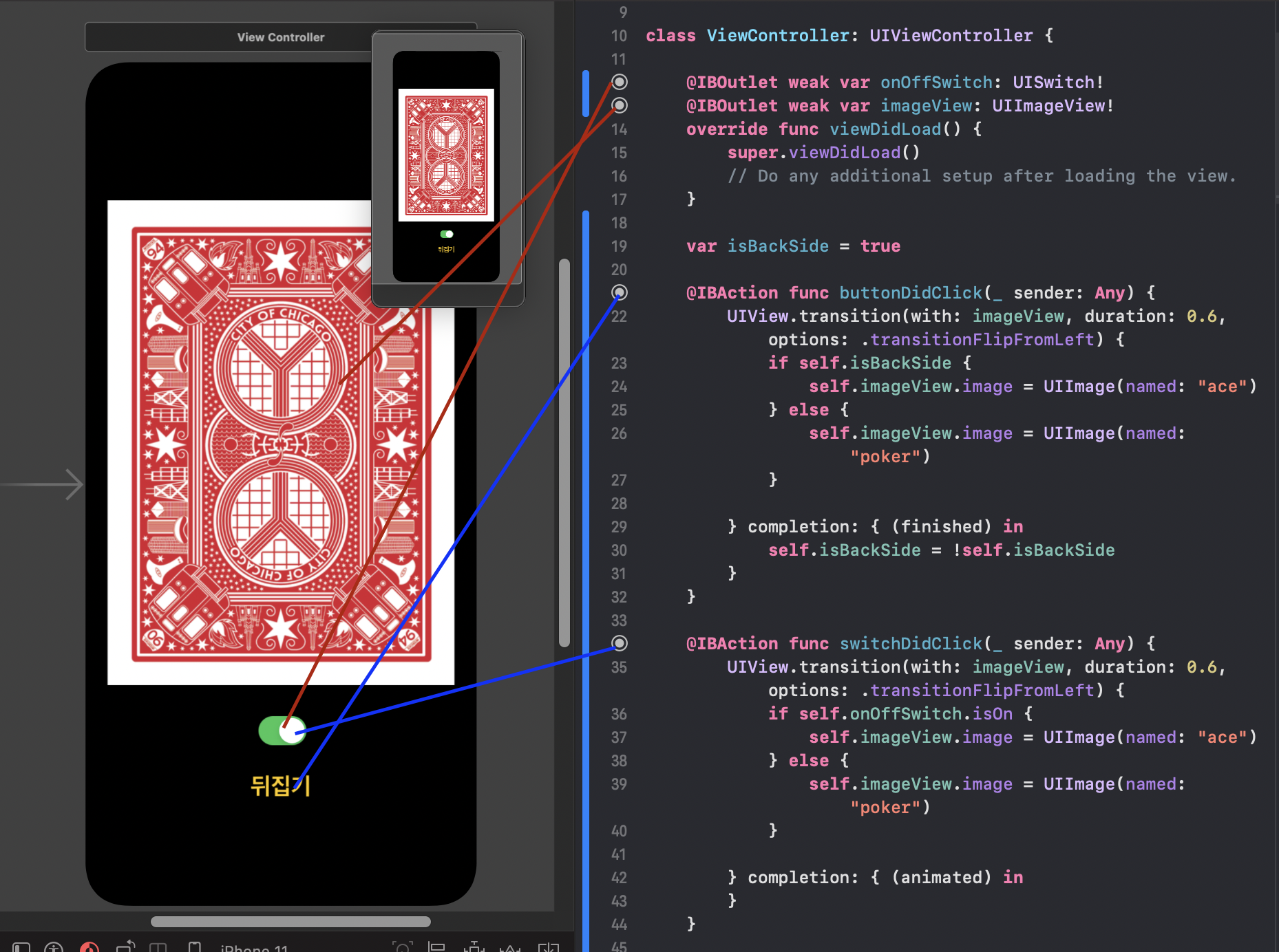 switch를 통해, 카드를 뒤집는 것도 위와 유사하다. switchDidClick() 액션 함수 참고하면 된다.