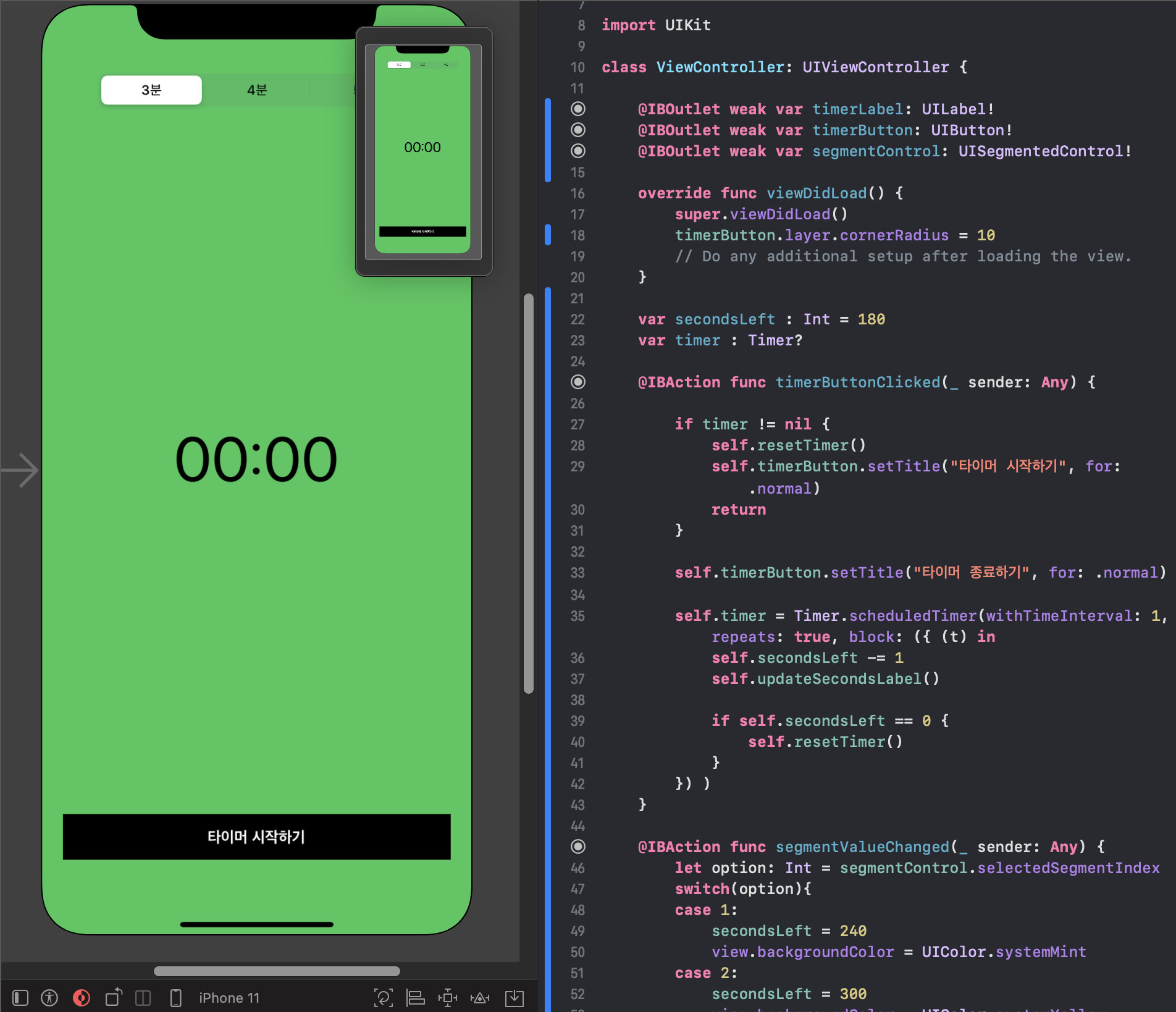 segment control을 사용해서 3분, 4분, 5분을 선택하면 배경 색깔이 바뀌고 해당 시간의 타이머가 실행된다. 멈추면 00:00으로 리셋된다. 시간이 60초 미만으로 남았을 시, 글씨 색이 빨간색으로 변한다. transition에서 transitionFlipFromBottom 사용해서 애니메이션을 추가했다.
