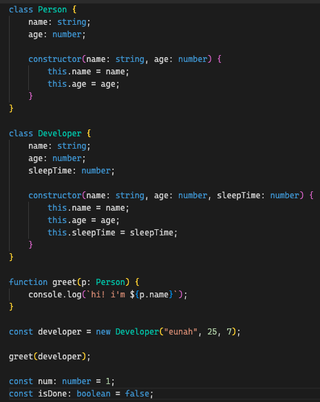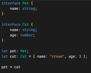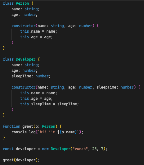 - 이름이 다른 객체라도 가진 속성이 동일하다면 타입스크립트 서로 호환이 가능한 동일한 타입으로 여긴다.