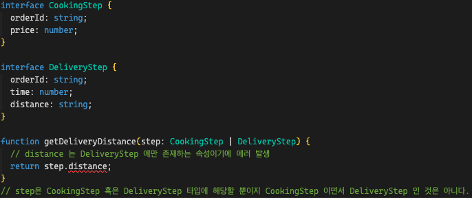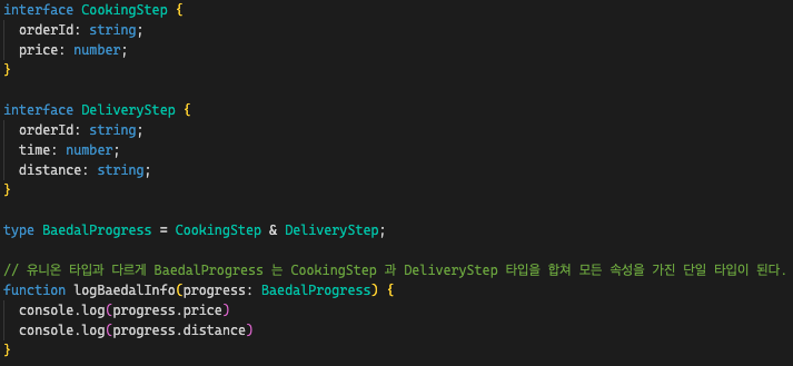 - BaedalProgress 교차 타입은 CookingStep 이 가진 속성과 DeliveryStep 이 가진 속성을 모두 만족하는 값의 타입(집합)이라고 해석할 수 있다.
